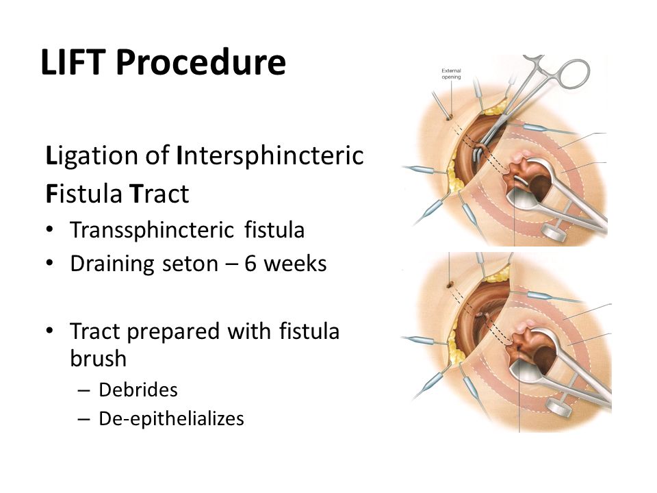 The ligation of the intersphincteric fistula tract (LIFT) procedure is also a treatment for fistulas that pass through the anal sphincter muscles, where a fistulotomy could cause incontinence.