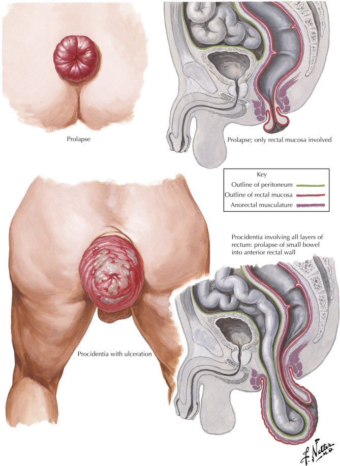 While a number of factors are thought to be linked to rectal prolapse, there is no clear cut “cause.” An estimated 30% to 67% of patients have chronic constipation (infrequent stools or severe straining) and an additional 15% have diarrhea. In the past, this condition was assumed to be linked to giving birth multiple times by vaginal delivery. However, as many as 35% of patients with rectal prolapse never gave birth and it can occur in men.